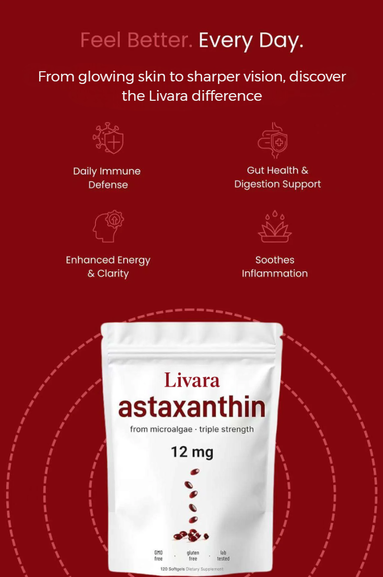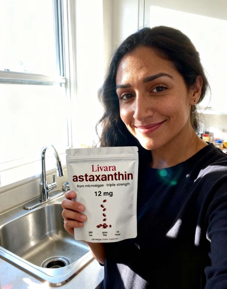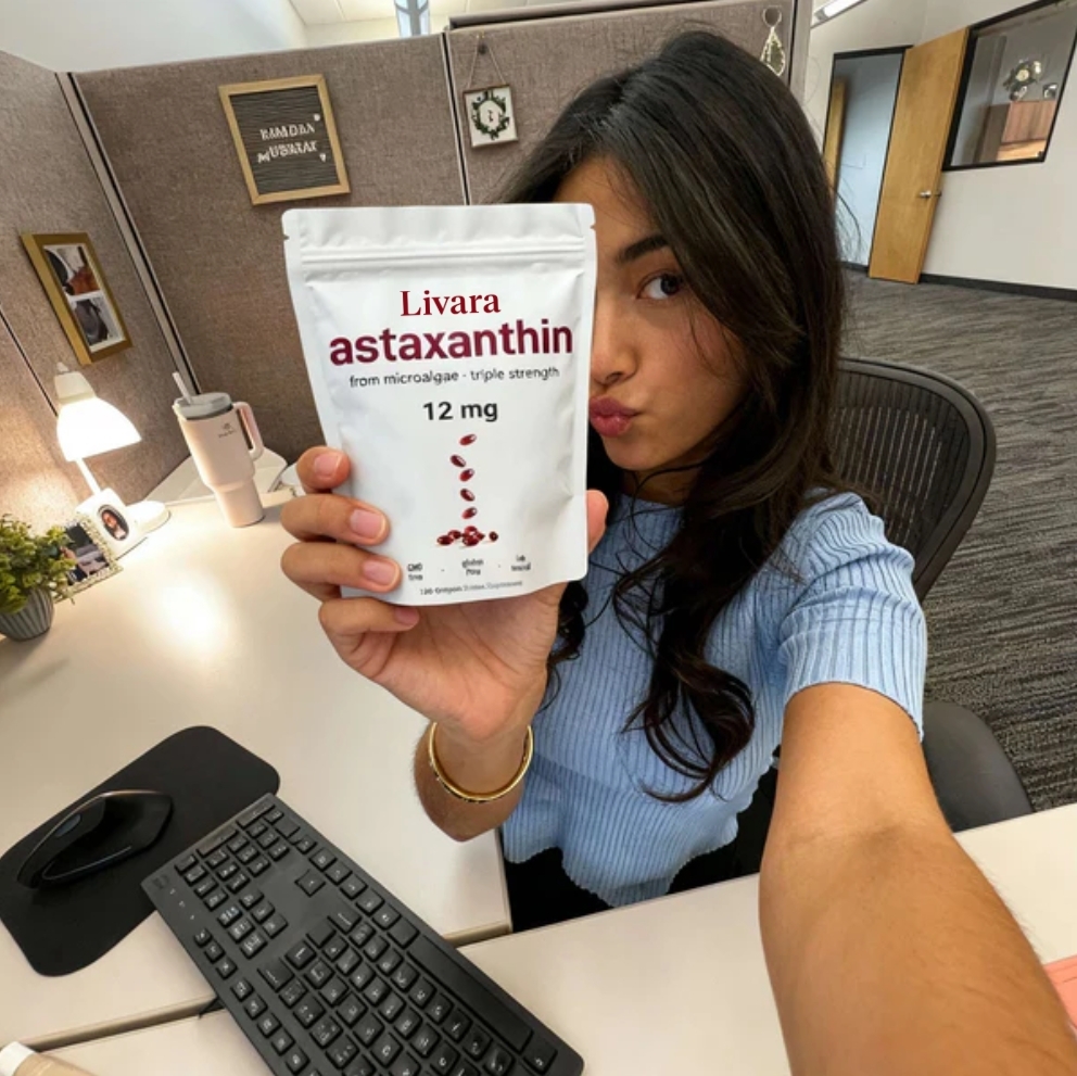 Livara Astaxanthin is a powerful, clean supplement designed to support your skin health, cellular vitality, and overall well-being.